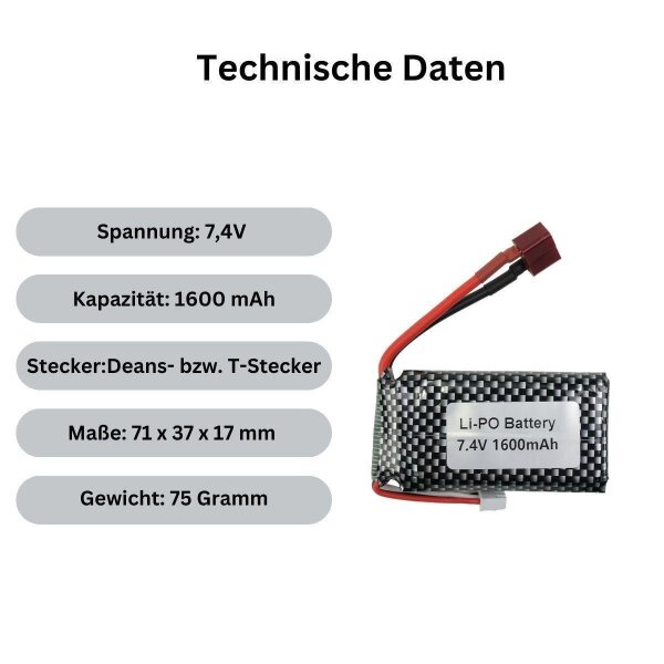 Akku 7,4V / 1600mAh / Li-Po / Deans Stecker / 9125 + USB-Ladekabel kompatibel mit 7,4V Akkus